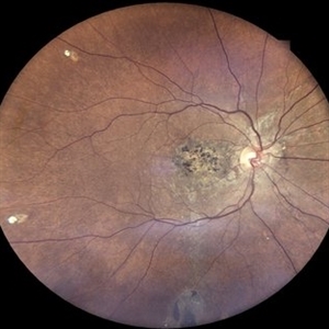 Fundus photograph of a 42-year-old woman with Angioid Streaks and scarred CNVM.