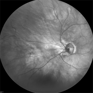 IR cSLO widefield image of an 16-year-old girl with blood in vitreous space after the rupture of neovascular vessels