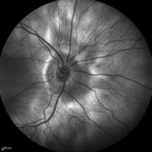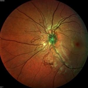 Multicolor widefield scan of a 16-year-old girl with a neovascularization from disc to vitreous space