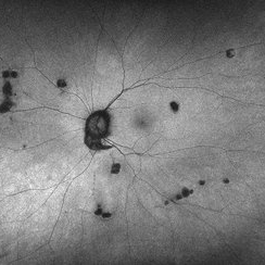 Autofluorescence image of a 63-year-old woman with presumed ocular histoplasmosis syndrome OD observed for change.