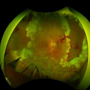 Ultra wide-field fundus photograph of a 55-year-old gentleman who had previously underwent laser retinopexy for multiple inferior retinal breaks. He presented with a macula-off retinal detachment from a new temporal break with proliferative vitreoretinopathy with fixed folds noted temporally and superonasally.