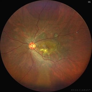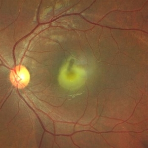 Fundus photo of left eye of a 37 year old female patient, who presented with defective vision of 1 month duration ,at 24 weeks of pregnancy, revealing Central serous chorioretinopathy with dense subretinal fibrin.