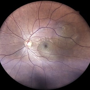Fundus photo of a 37 year old man with multiple areas of RPE atrophy in the posterior pole , subretinal fibrotic band in the inferior part of macula and inferior tear drop sign .