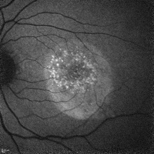 Fundus autofluorescence image of a 45 year old man with CSCR revealing subretinal precipitates as hyperautofluorescent dots.