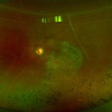 Ultra wide field fundus photograph of left eye of 47 year old male patient, revealing pigmentary changes and RPE degeneration at the macula as well as inferiorly suggestive of old tear drop CSCR .