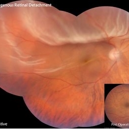 Montage fundus photo of superior retinal detachment in right eye of a 45 year old male patient