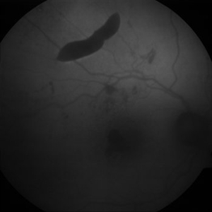 80-year-old female with subfoveal occult CNV and large extrafoveal PED which underwent spontaneous RPE rip. Autofluorescence image shows hypoautofluorescence in crescentic area of absent RPE due to rip, and also RPE atrophy adjacent to fovea. Intervening small areas of hypoautofluorescence are due to subretinal haemorrhage.