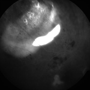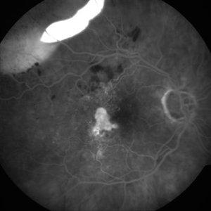 80-year-old female with subfoveal occult CNV and large extrafoveal PED which underwent spontaneous RPE rip. Early phase FA showing intense hyperfluorescence in the area of acute absence of RPE.