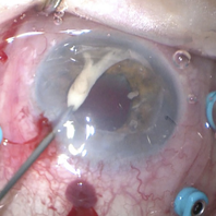 An intra-operative photograph demonstrating the technique of removing a hypopyon from the anterior segment.