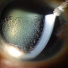 Slit lamp photograph showing heavy oil bubbles in anterior chamber.