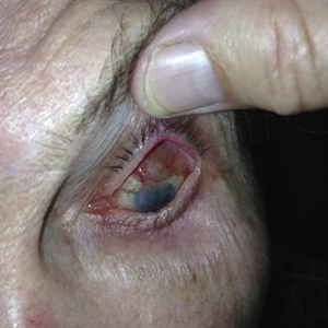 A 85-year-old lady who presented with an eroding intraocular lens. She had been initially treated with herbal medicines which failed to control the infection.