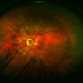 Fundus autofluorescence of a myope with PVD and staphyloma.