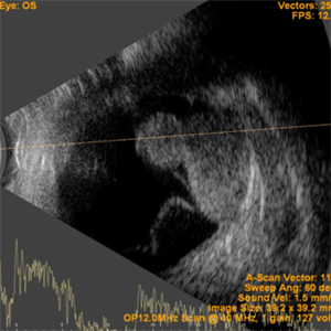 B-scan showing an intraocular mass with collar button appearance. Suspected case of choroidal melanoma.