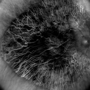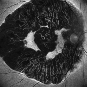 Image of a patient with geographic atrophy taken in retro mode. The deeper choroidal vessels are prominently seen.