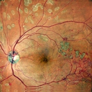 Color fundus photograph of a 48-year-old showing an inferno temporal BRVO. Old BRVO with neovascularization seen super-temporally.