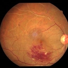 Color fundus photograph of a patient with a boat shaped sub hyaloid hemorrhage.