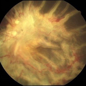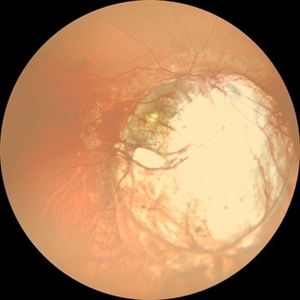 Color fundus photograph showing a long standing RD with PVR with fixed retinal folds.