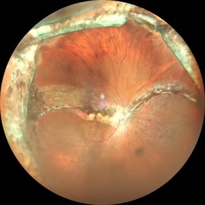 Wide field color fundus image of a case of buckle intrusion into the eye.