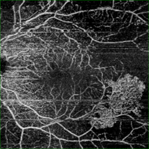 OCT angiography image of the superficial plexus showing neovascularisation infero-temporal to macula. Avascular areas are seen temporally.