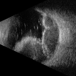 Ultrasound of the right eye of 43-year-old male presenting with suprachoroidal hemorrhage, note the multilobulated heterogenous echogenic mass aspect of the choroid