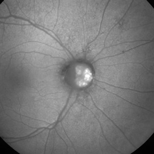 Autofluorescent image of the right optic disc showing autofluorescence of optic disc drusen.