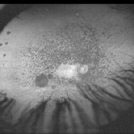 Panoramic autofluorescence fundus photograph of the left eye of a 40-year-old male with retinitis pigments and macular hole