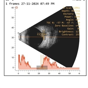 B Scan showing measurements of mass in a case of optic nerve melanocytoma.