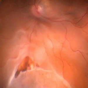 An intra operative still showing us a large horse shoe tear which has posterior location inferiorly causing an retina detachment.