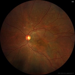 Fundus fotograph of a 43-year-old man with chronic central serous chrorioretinopathy, with recurrent episodes since 2020.