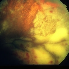 Fundus photograph of a patient with AIDS who has developed toxoplasma retinochoroiditis; large yellow patch of retinitis along the superior arcade fading the vasculature with feathery edges. #1