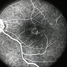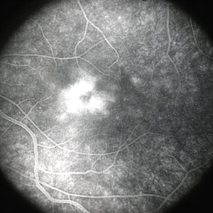 Fluorescein angiography of a patient with CME with typical flower petaloid leakage at late phase.