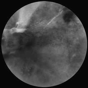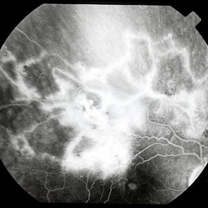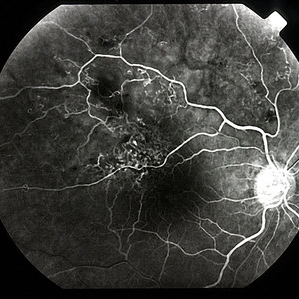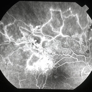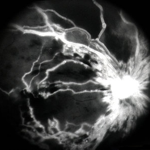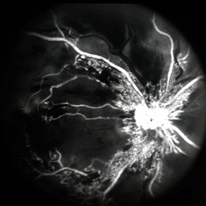 Extensive NVD, NVE and vitreous haemorrhage complicating previous attempted laser-induced chorioretinal anastomosis for CRVO, left eye - early fluorescein angiogram. Note: this is a scanned film negative FA. Note also subretinal neovascularisation at superotemporal anastomosis site.