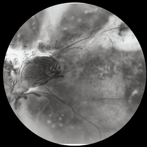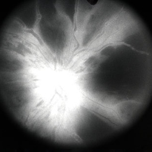 Severely ischaemic central retinal vein obstruction (CRVO), right eye - early fluorescein angiogram showing almost complete capillary non-perfusion.