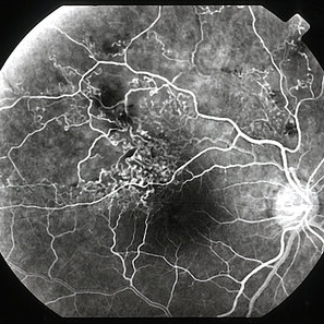 Delayed-onset visual loss due to leakage from telangiectatic vessels in an eye with previous branch retinal vein obstruction (BRVO). Fluorescein angiogram 1 of 4.