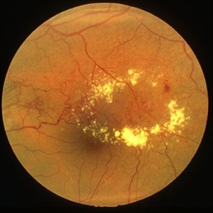 Delayed-onset visual loss due to leakage from telangiectatic vessels in an eye with previous branch retinal vein obstruction (BRVO). Color image, right eye, 3 years following laser treatment. VA slowly recovered to 20/30.