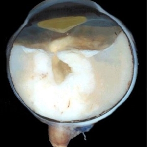 Gross pathology of enucleated eye of a pediatric patient showing a retinoblastoma represented by an elevated whitish mass.