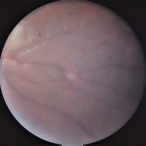 Bilateral retinoblastoma in a 3 month-old baby boy. Large peripheral whitish lesion.