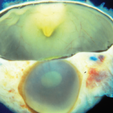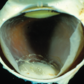 Enucleated eye of a pediatric patient showing a total retinal detachment and a large exophytic retinoblastoma.