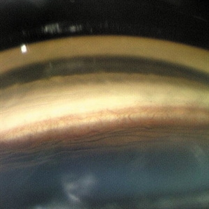 An 82-year-old man with a advanced stage of neovascular glaucoma. A slit-lamp photograph illustrates iris ectropion with prominent iris neovascularization.