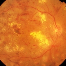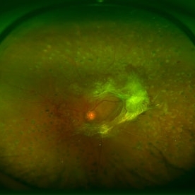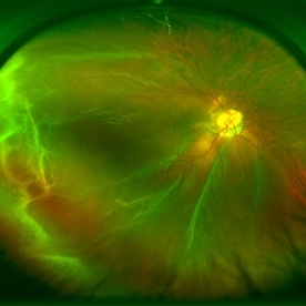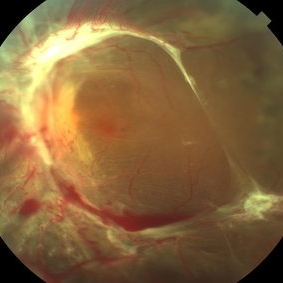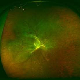Wide-field fundus photograph of a 56-year-old man with tractional retinal detachment due to proliferative diabetic retinopathy.