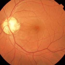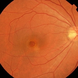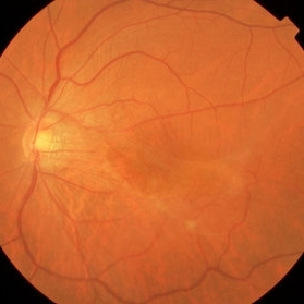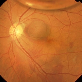 Fundus photograph of a 38-year-old man with macular detachment associated with an optic disc pit.