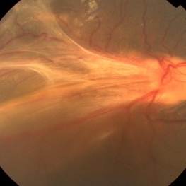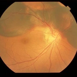 Wide-field fundus photograph of a 38-year-old woman with a macula-involved retinal detachment due to a tiny break localized around the edge of a lattice degeneration.
