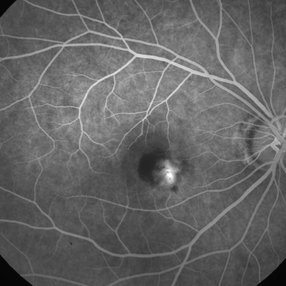 Fluorescein angiogram of a 36-year-old woman with an idiopathic juxtafoveal CNV.