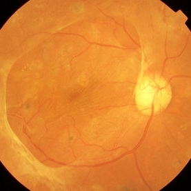 Fundus photograph of an 86-year-old woman with an extra-macula subretinal hemorrhage associated with polypoidal choroidal vasculopathy.