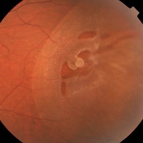 Fundus photograph of a 6-year-old boy with a falciform retinal detachment suspiciously associated with toxocariasis.