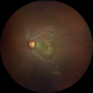 Fundus photograph of an 32-year-old woman with optic disc pit and macular RPE atrophy .