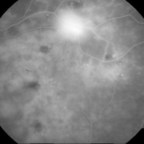 A FAG image of a 84-year-old female. Late venous phase of the left eye. Hyperfloercent area in upper temporal quadrant represents NVE. Many hyperflorescent dots can be seen. Few hypoflorescent areas are deep retinal hemorrhages.