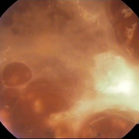 Color fundus photography of a 62- year-old diabetic patient. Severe fibrous proliferations with traction retinal detachment can be seen. Pars plana vitrectomy was preformed on that eye.