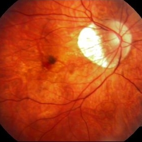 Myopic Choroidal Neovascular Membrane Myopic Choroidal Neovascular MembraneMar 25 2013 by Ratimir Lazic, MD, PhD Color fundus photography of a 33-year-old female. In macular area subretinal hemorrhage can be seen. Area of atrophy temporal from PNO. Myopic changes of posterior pole and mid periphery can be noticed. The patient has been treated with 2 consecutive ranibizumab intravitreal injections. BCVA at baseline was 0,05 (Snellen lines) and 0,3 (Snellen lines) 2 months after. Photographer: Marko Lukic, MD Imaging device: Zeis Visucam Lite 2 Condition/keywords: high myopia, myopic choroidal neovascularization (CNV), ranibizumab