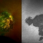 Optos fundus autofluorescense image shows multiple hyper and hypo autofluorescent lesions corresponding to active and healed lesions in the midperipheral retina and periphery suggestive of varied stage presentation of lesions.